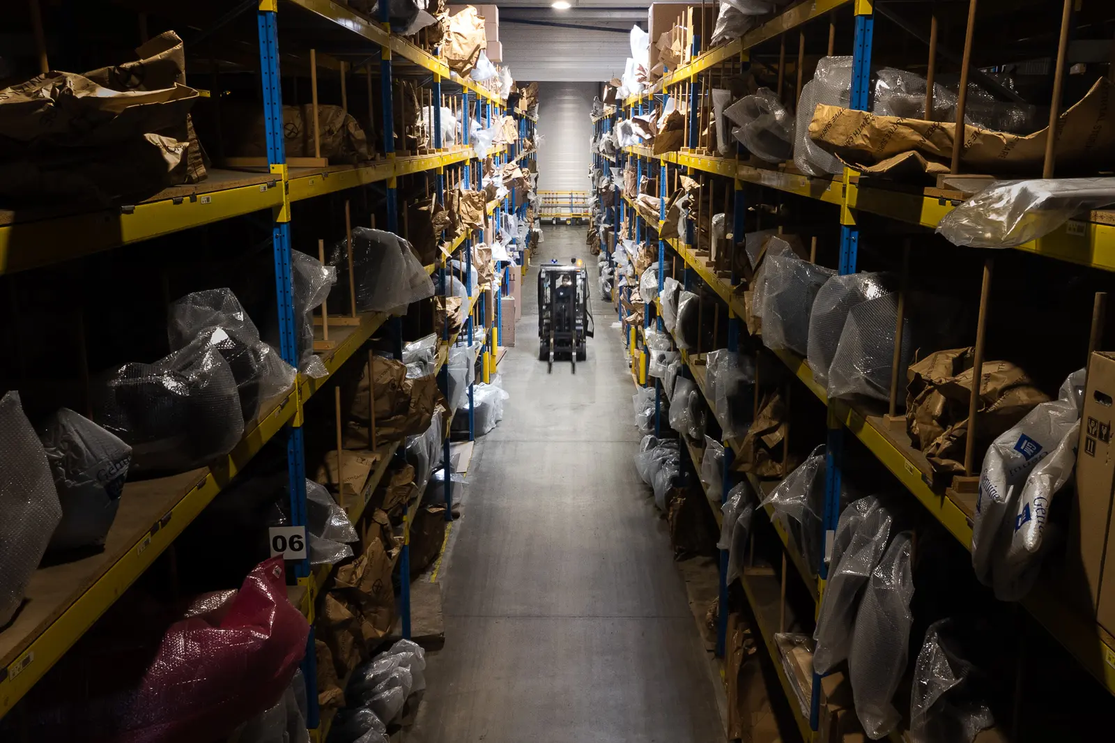 Le site se découpe en plusieurs univers visuels très différents. L'entrepôt de pièces détachées avec ses allées de rayonnages hauts et ses scènes de cariste. Le stock pneumatiques, plus graphique, où les empilements de pneus créent une géométrie noire qui tranche avec les rails bleus des racks.